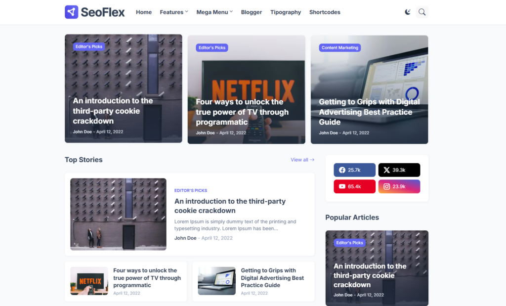 SeoFlex, modern tasarımı, üstün performansı ve Core Web Vitals uyumluluğu ile öne çıkan, SEO odaklı ve çok yönlü bir ücretsiz Blogger temaları ndan bir tanesidir. Arama motorlarında daha iyi sıralamalar elde etmek ve dijital görünürlüğünü artırmak isteyen blog yazarları için ideal bir tercihtir. Son teknolojiyle geliştirilen bu şablon, kullanıcı deneyimini ve hız optimizasyonunu ön planda tutar.